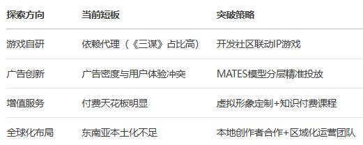 最後,盈利模式的多元化探索仍處於初級階段,遊戲業務依賴代理爆款,廣告形式創新不足,如何構建可持續的盈利循環是長期挑戰。