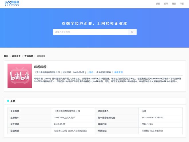 據網經社企業庫顯示,“嗶哩嗶哩”屬於上海幻電信息科技有限公司,成立於2013年,法定代表人為徐逸。