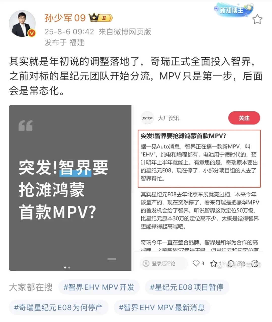 此外,有消息稱,奇瑞首款豪華MPV產品原本是星紀元E08,但有相關人士透露,“星紀元E08目前已停止開發,小部分星紀元E08項目組的員工已轉崗至智界,壯大了智界研發MPV的力量。”