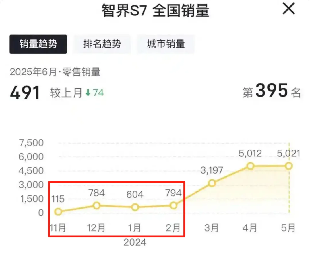 除了在今年1月智界S7的月銷量勉強突破1千輛,之後便一直處於幾百輛的數據,今年6月的銷量更是跌破500輛。