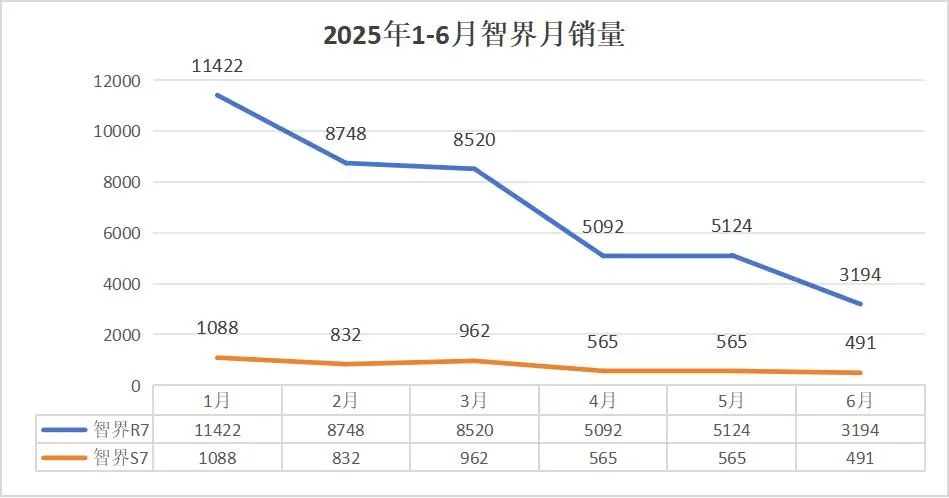 當前智界的在售車型為智駕R7和智界S7。根據懂車帝數據,**2025年上半年,智界品牌累計銷量為4.66萬輛。**其中,智界R7上半年賣出4.21萬輛,是絕對的銷量擔當。與之相比,智界S7則慘淡很多,半年只賣出了4503輛新車。