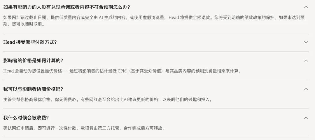 **這種模式也天然契合營銷領域“效果至上”的基因。**Head等Agent服務商普遍採用 “按廣告消耗分成”或“以效果指標(如CPA/CPM/ROAS)結算”的收費模式。品牌方只需聚焦最終轉化目標,從根本上消除了“為未知能力預付”的決策阻力。並且當Agent的收益與品牌業績深度綁定,其角色從“工具供應商”轉變為“增長合夥人”,這種利益共同體關係,會大幅降低品牌對新技術的學習與試錯門檻。