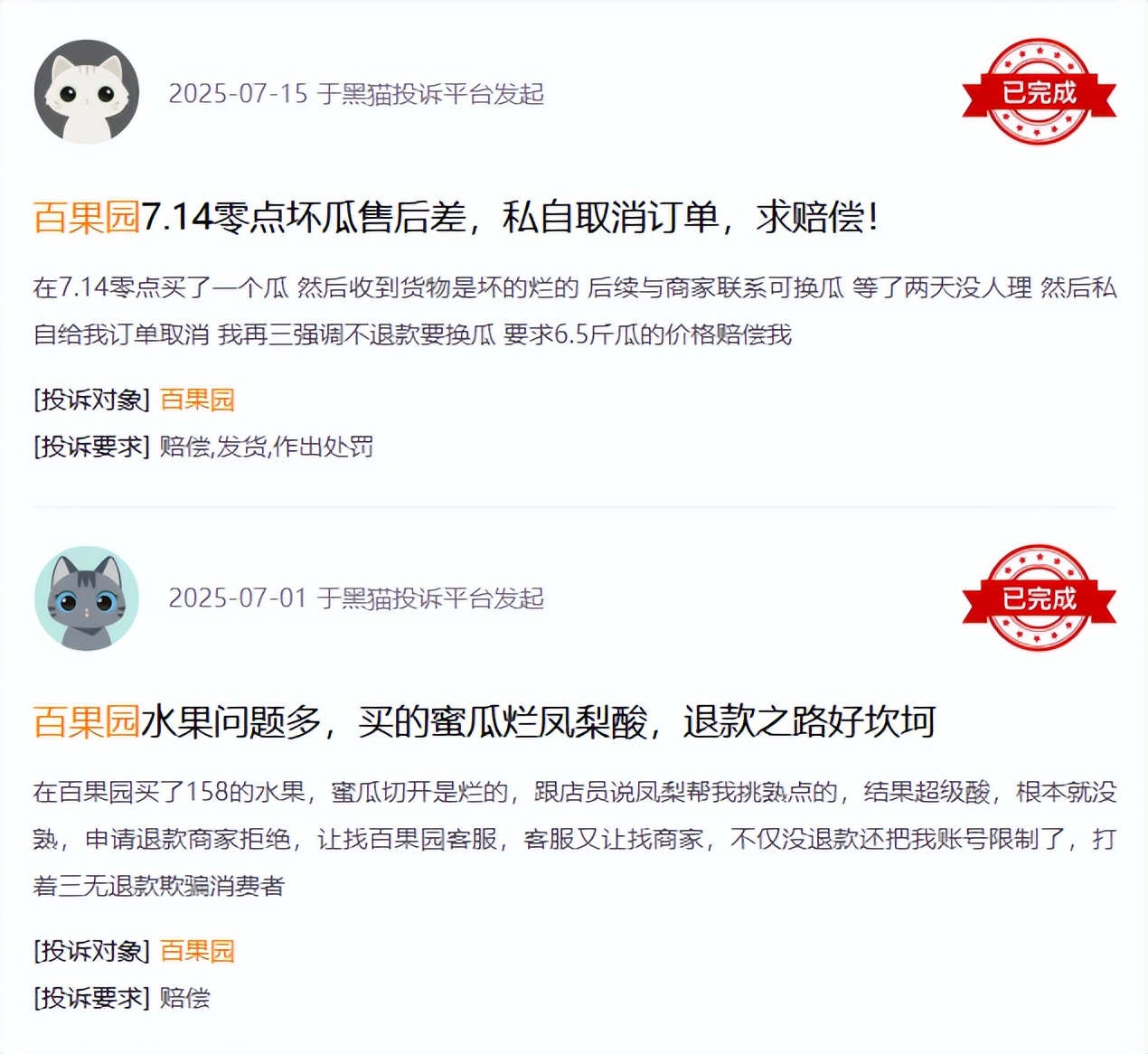 黑貓投訴平台上,有超3000條投訴與百果園有關,其中不少聚焦品質問題。比如榴蓮發苦,酒精發酵味道特別重;收到壞果;蜜瓜是爛的,鳳梨超級酸;荔枝嚴重發黴……