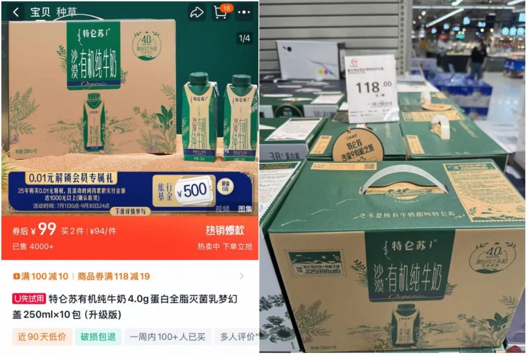 我們對比後發現,這款特侖蘇沙漠有機純牛奶4.0g蛋白(250ml×10包),目前在特侖蘇天貓旗艦店售價已調至99元/提,但在永輝、紅旗等線下商超,價格仍是118元/提,折算下來,單瓶價格達11.8元。