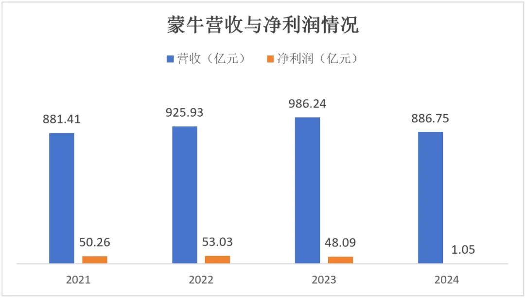 根據財報顯示,2024年蒙牛全年營收886.75億元,同比下降10.09%;五大業務板塊營收出現了全面下滑;歸母淨利潤1.05億元,同比驟降97.83%。