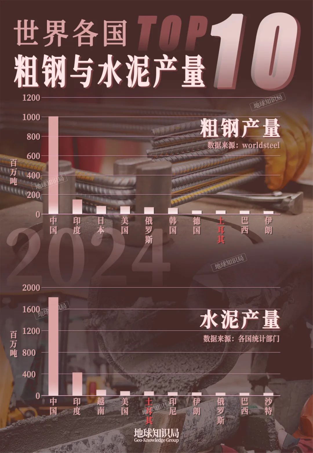 以建築行業所需的鋼鐵和水泥為例。在2021 年,土耳其是世界第7、歐洲第2大鋼鐵生產國。2023年以後,土耳其的產量有所下降,但仍保持在了世界第8。