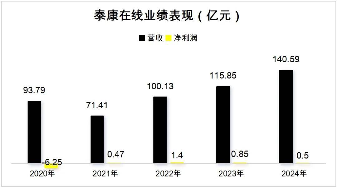 相較之下,依託於母公司的支持,泰康在線的情況就好多了。不過,其近三年業績表現不佳,淨利潤持續縮水,2024年暴跌41.31%到0.5億元。