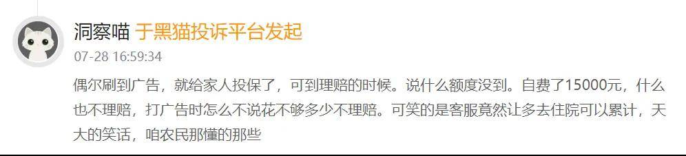 黑貓投訴上,有用户吐槽,在騰訊微保刷到廣告,就給家裏人投保了,可到理賠的時候,説額度沒到,最後自費了15000元,但“廣而告之”時並沒有説。