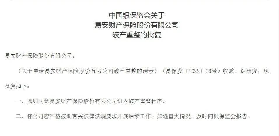 據柒財經瞭解,2018年到2020年一季度末,易安財險累計“虧損6.28億元,核心償付能力充足率直線下滑。2020年7月,銀保監會決定對易安財險實施接管。兩年後,易安財險破產重整,同時公開招募戰略投資者。