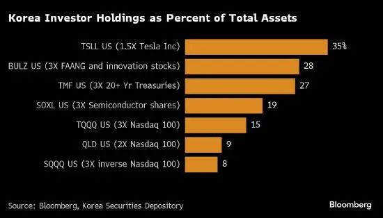 不僅如此,韓國散户還極其鍾愛槓桿ETF,收益會被成倍放大,當然,風險也是成倍放大,2023年時,彭博社就發現,一個1.5倍做多特斯拉的ETF,竟然35%份額都是韓國人持有的,還有兩個3倍槓桿的ETF,分別押注美國科技股和芯片股,韓國人也持有其中的28%和27%,賭性是真的大,有種**“要麼登天要麼死”**的美感。