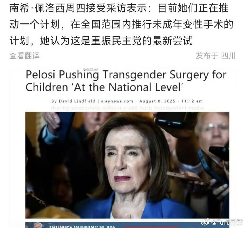之前很多人問我你為什麼支持特朗普和普京,不是要麼支持美國要麼支持俄羅斯嘛。棉花絮認為一切都要歸根於美國民主黨及背後的西方精英集團做的太極端了。南希·佩洛西接受採訪表示目前她們正在推動一個計劃,在全國範圍內推行未成年變性手術的計劃,她認為這是重振民主黨的最新嘗試 。所以棉花絮內心深處還是希望反對西方精英集團的普京和特朗普能有些收穫。