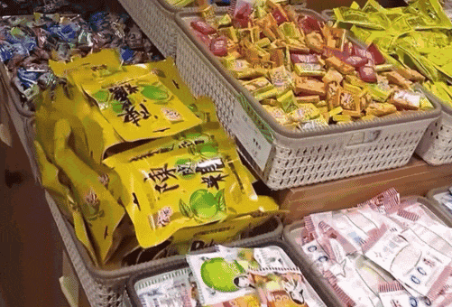 而進入這些“時光雜貨鋪”後,你會發現可選的零食確實琳琅滿目:“唐僧肉”辣條、“流口水”糖、大大泡泡糖、牛羊配、酸妞……貨架上的商品幾乎完全復刻了90年代校園周邊的零食矩陣。