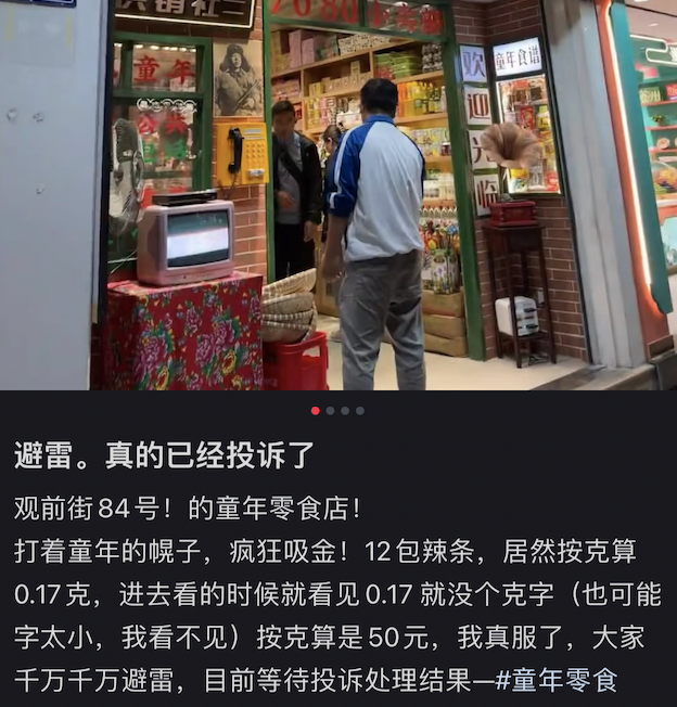 不過商家也有自己的委屈,因為懷舊零食店通常會開在繁華地段,房租、水電費會高一點,所以東西就貴一點,這種“地租轉嫁”的邏輯在旅遊景區尤為明顯。