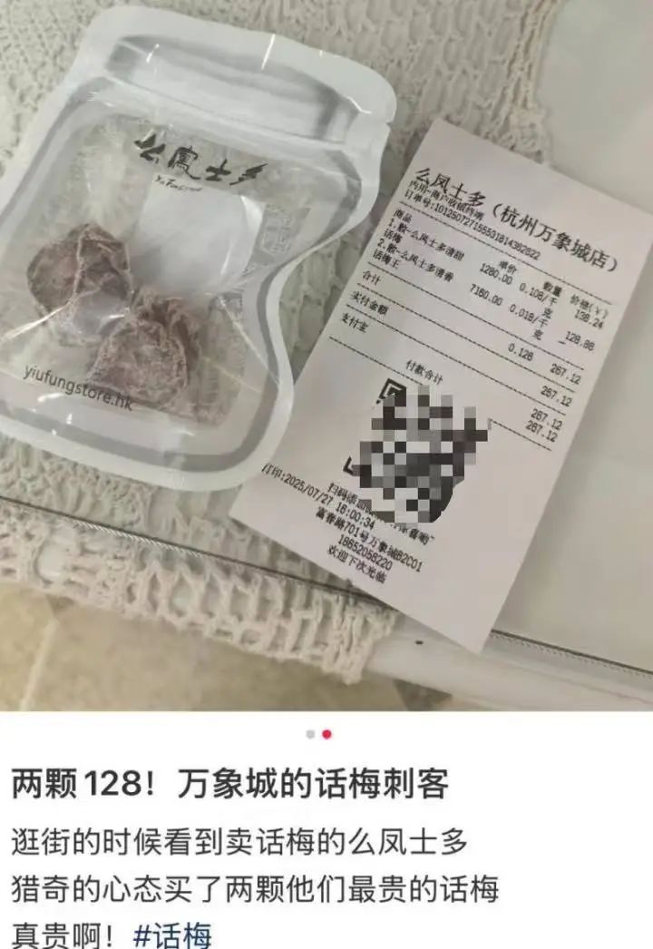 最近就有網友發帖稱在杭州遭遇了“話梅刺客”——兩顆話梅128元,直接被價格擊穿。