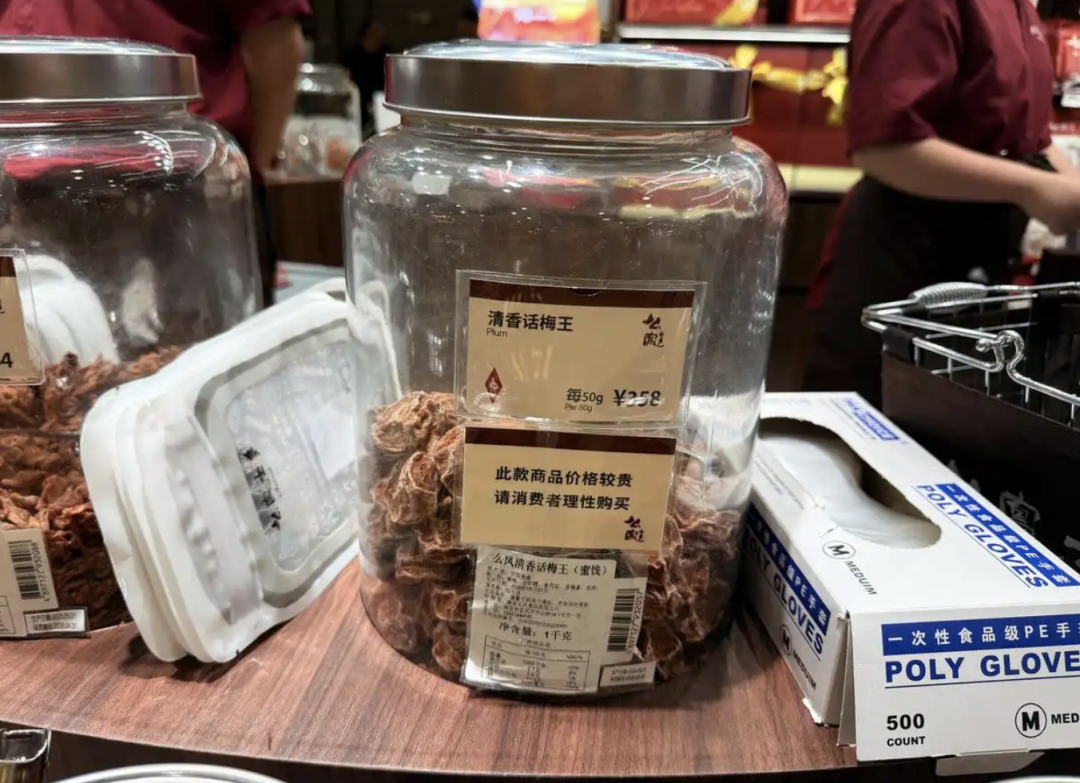 品牌主打的“清香話梅王”每斤3580元,因為定價高昂有着“話梅中的愛馬仕”之稱。但卻也是供不應求,有網友慕名想去買來嚐嚐,到了櫃枱才發現早就售空了。