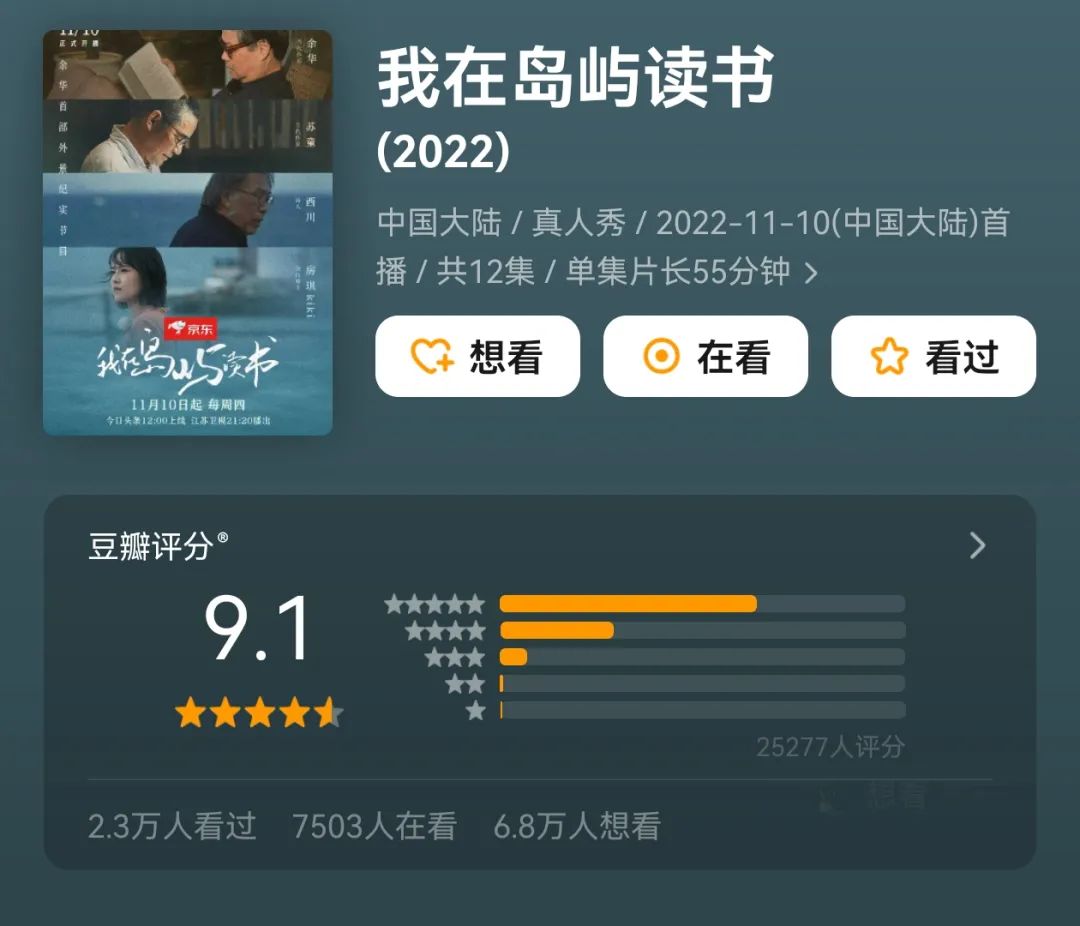 除了音樂綜藝外,江蘇衞視也有符合自身品牌調性的代表性節目,比如和今日頭條聯合出品的《我在島嶼讀書》。這類紀實類的讀書節目,恰好戳中了當下年輕觀眾的迷茫情緒,聆聽專家、學者對於人生、世界的看法,反而成為很多年輕人的人生“解題方式”。在短視頻平台,餘華、莫言、蘇童等作家的言論,總是被截圖廣泛傳播。