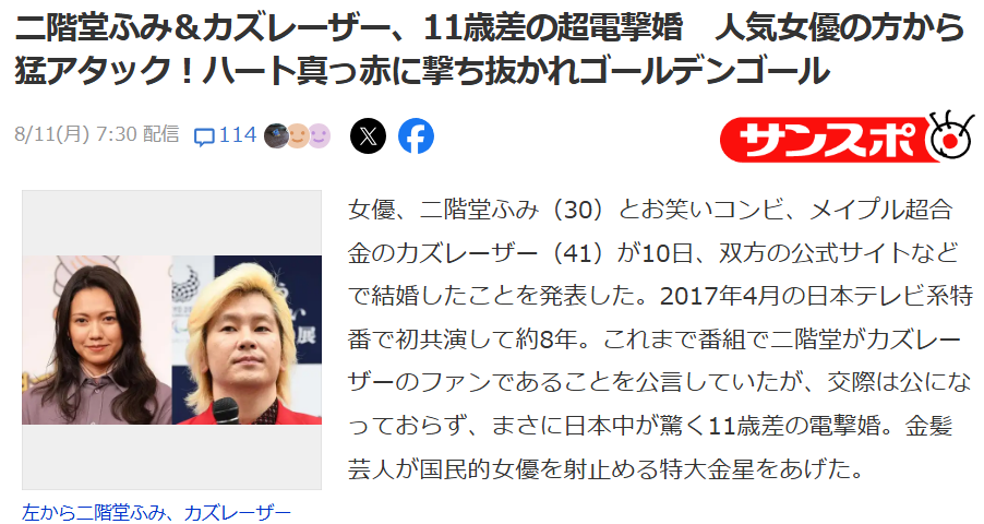 8月10日,演員二階堂富美(30歲)在自己的官方網站上宣佈,與搞笑組合“楓葉超合金”的成員卡茲鐳射(41歲)結婚。