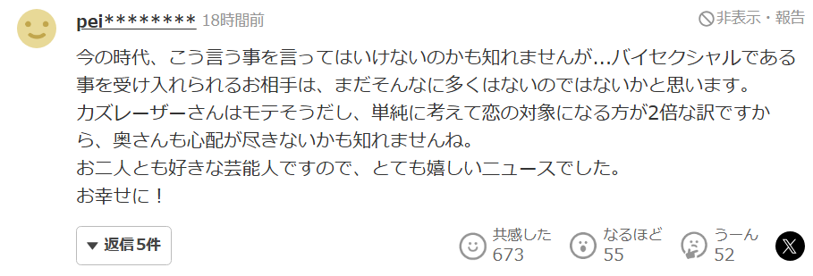 卡茲鐳射看起來很受歡迎,單純地計算能成為戀愛對象的人是一般人的兩倍,所以妻子可能也會擔心不已吧。因為兩位都是我喜歡的藝人,所以這是個好消息。祝幸福!”