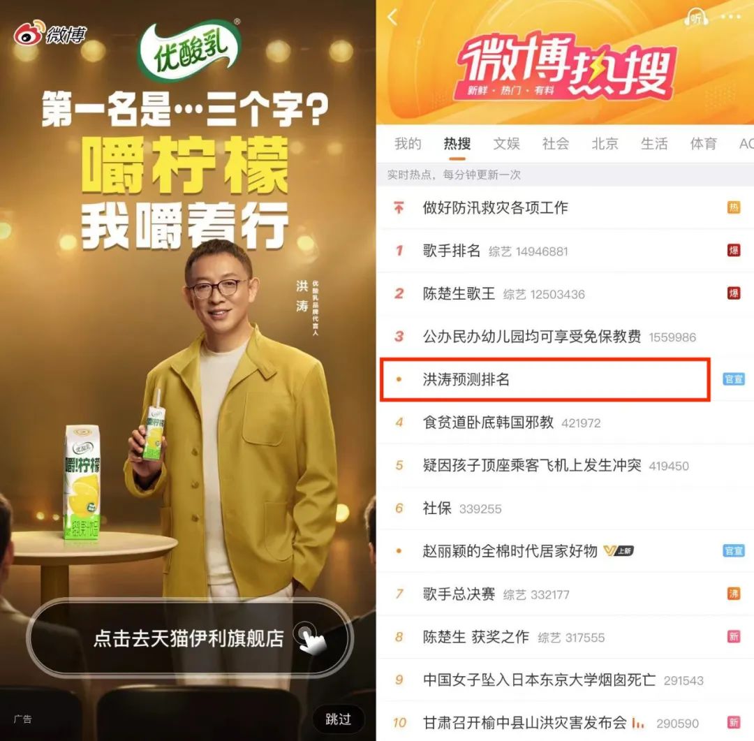 總決賽前一天,伊利優酸乳直接官宣往季節目的總導演洪濤成為品牌代言人,隨後,營銷動作便與《歌手2025》總決賽同頻登場,TVC內容借勢、微博開屏曝光、banner位購買等資源強勢進攻,甚至在當晚歌王宣佈之後,“歌手排名”“陳楚生歌王”兩個“爆”了的微博熱搜詞條下面,赫然出現着“洪濤預測排名”這一伊利優酸乳的討巧表達。