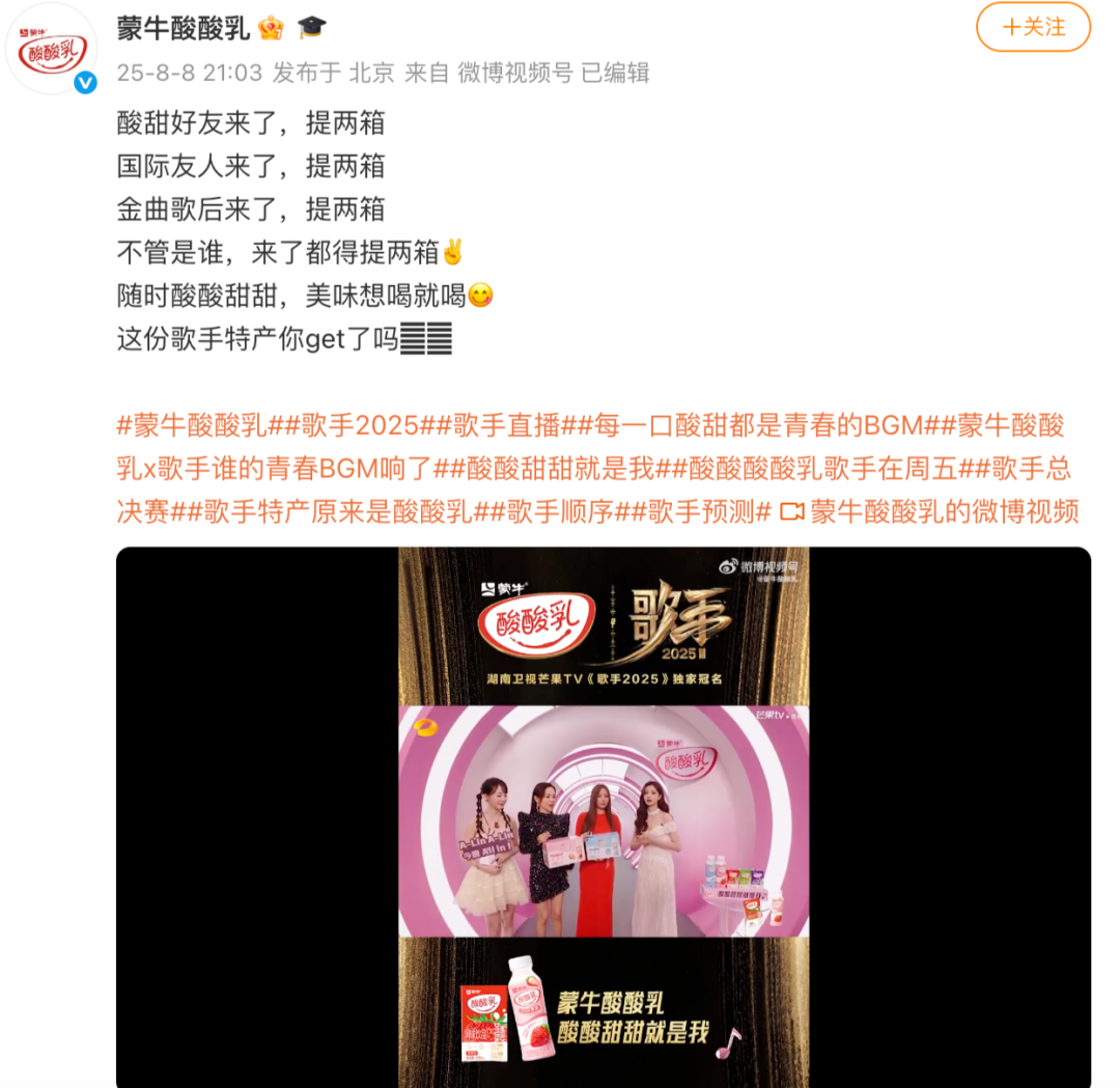 可以説,蒙牛酸酸乳這個獨家冠名者,通過《歌手2025》做了不少有效營銷,讓這一從超女時代就陪伴大家的音綜搭子再度高舉高打地回到了全網視野。