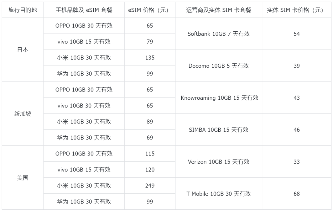 但問題在於,這些 eSIM 旅遊卡的定價通常都比直接買當地實體旅遊 SIM 卡要貴,我隨便選了三個熱門旅遊目的地國家,對比了下它們的價格,普遍都是實體 SIM 卡要便宜些,但相對來説有效期也短。