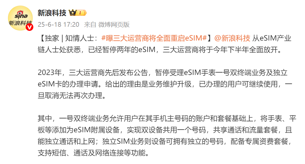 微博,獨家 | 知情人士:曝三大運營商將全面重啓eSIM