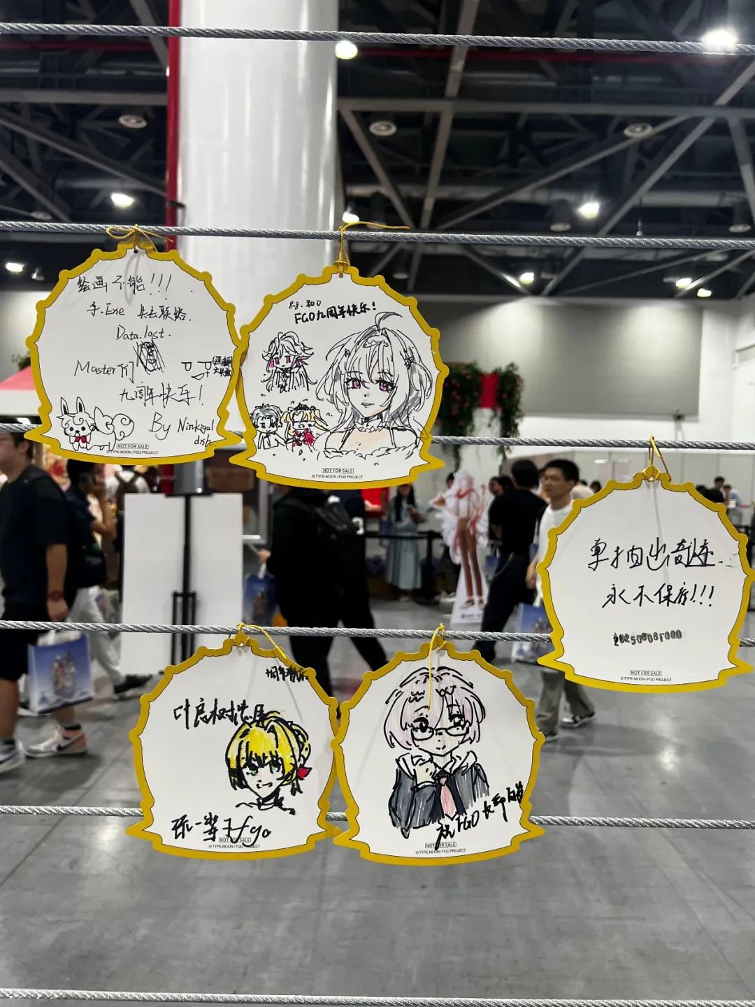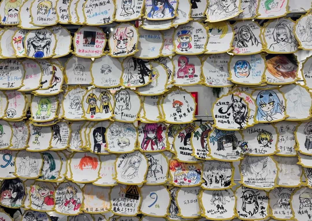 無料交換區的位置,其實很多桌子上都放着彩色馬克筆,staff也會熱情地遞上紙筆,邀請玩家在繪畫板上留下自己的小籤或速寫。第一天到達FES時,我就看到不少人甚至還沒來得及逛展或拍照,就先迫不及待地蹲在板前塗畫——有人畫英靈,有人寫台詞,有人乾脆畫了自己第一次抽到TA時的表情包。