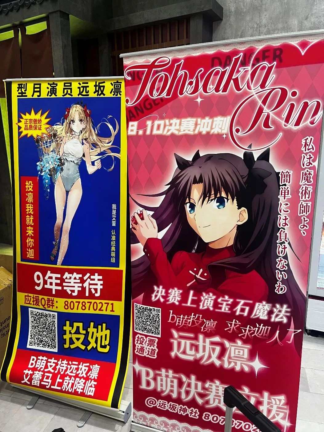 結果呢,八年時間過去,這樣的格局還是沒發生變化。以至於我在FES現場看到玩家帶着水艾蕾給遠坂凜拉票的易拉寶,那股氣勢完全沒有拉票的卑微,反而像是在炫耀武力、展示軍火。