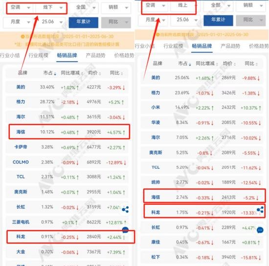 來自權威市場調研機構奧維雲網(AVC)的監測數據顯示,2025年H1,海信空調線下市場佔有率提升0.48%、ASP提升4.57%,排名第四,僅次美的、格力和海爾,以及,在新風賽道,海信空調佔有率已達全網第一!(新風銷額佔有率43.9%,同比大漲12.3%)