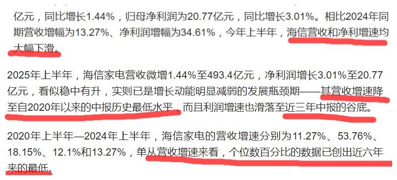 我們還是先來回顧一下海信家電的財報,2025年上半年,海信家電營收493.4億元,同比增長1.44%,淨利潤20.77億元,同比增長3.01%,雖然營收和淨利潤都保持住了增長的態勢,客觀來看,營收和利潤的下行趨勢倒也不容忽視。