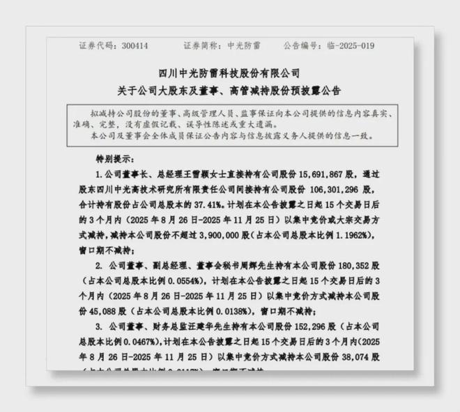 近日,中光防雷(300414.SZ)發佈的一則減持公告,在資本市場激起層層漣漪。公告內容顯示,公司董事長兼總經理王雪穎、董事兼副總經理及董秘周輝、董事兼財務總監汪建華,基於個人資金需求,計劃減持公司股份。