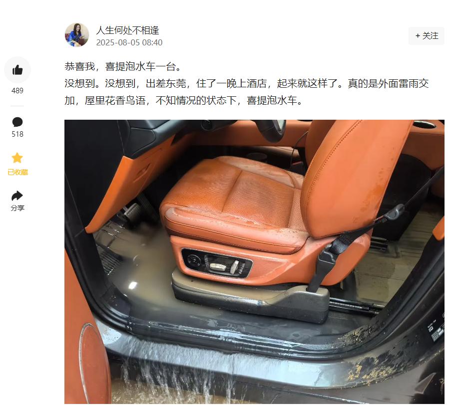 “出差東莞,住了一晚上酒店,起來就這樣了。真的是外面雷雨交加,屋裏花香鳥語,不知情況的狀態下,喜提泡水車。”有車主無奈的表示。