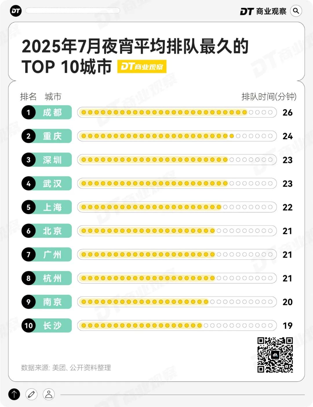 當下夜宵排隊最嚴重的城市,仍然是人潮湧動的一線、新一線城市們。從2025年7月的平均排隊時長來看,想在成都、重慶吃上夜宵,平均得排隊26分鐘和24分鐘。深圳、上海、杭州等地,平均排隊時長也都超過20分鐘。