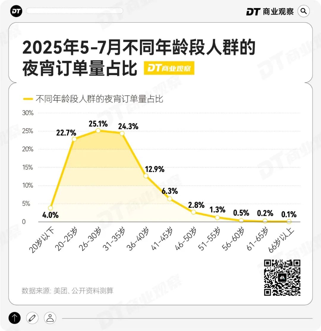 美團數據顯示,26-35歲的人羣是夜宵餐飲的核心消費人羣。2025年5-7月的夜宵訂單中,49.4%夜宵訂單來自26-35歲的人羣。這是一羣懂生活、也需要被慰藉的打工人,夜宵成為他們釋放情緒與重建能量的一個“窗口”。