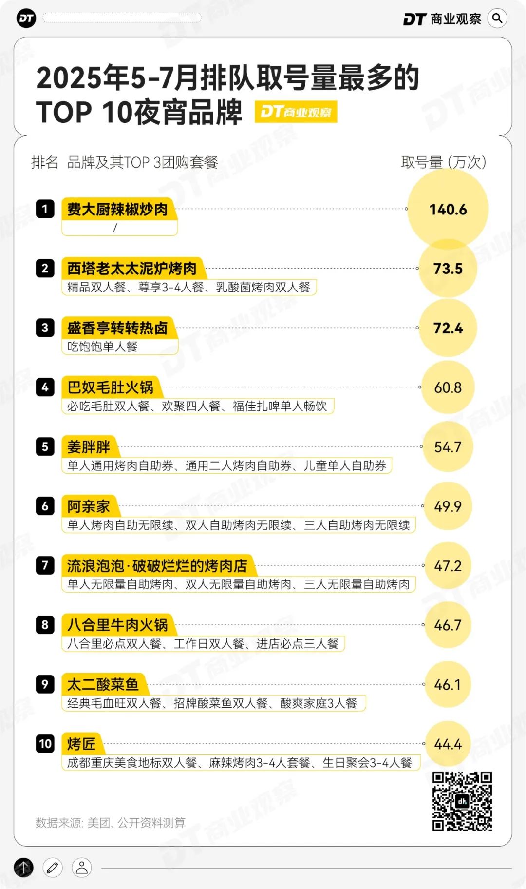 美團線上排隊數據顯示,2025年5-7月,在其覆蓋的超萬個品牌、逾7萬家門店內,全國排隊取號數最多的TOP 3品牌是費大廚辣椒炒肉、西塔老太太和盛香亭轉轉熱滷,取號數分別達到140.6萬次、73.5萬次和72.4萬次。