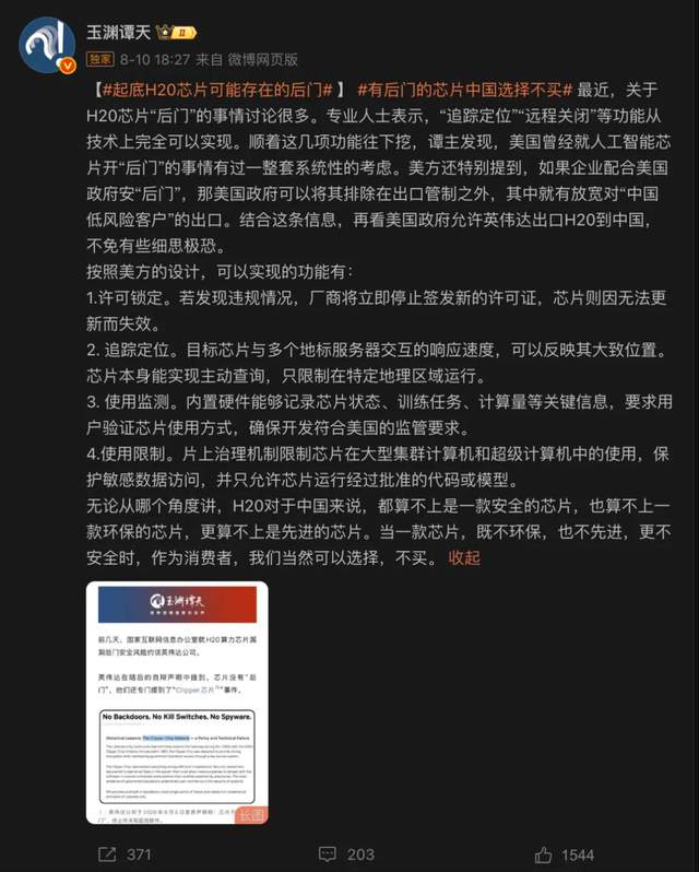 知名媒體“玉淵潭天”詳細分析了英偉達H20可能存在的問題,並並明確:當一款芯片既不環保,也不先進,更不安全時,“作為消費者,我們當然可以選擇,不買。”