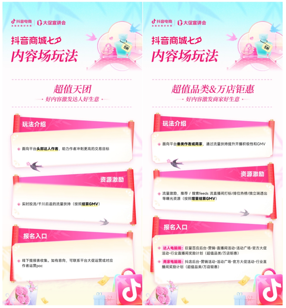 針對垂類作者或商家的**「超值品類 & 萬店鉅惠」**玩法,通過平台流量激勵,鼓勵創作符合七夕氛圍的內容並積極開播。表現優異者,可獲得推薦流/搜索Feeds流的直播間打標、熱力榜單排位、獨立端口曝光等豐富資源,有效提升開播積極性與GMV增量。