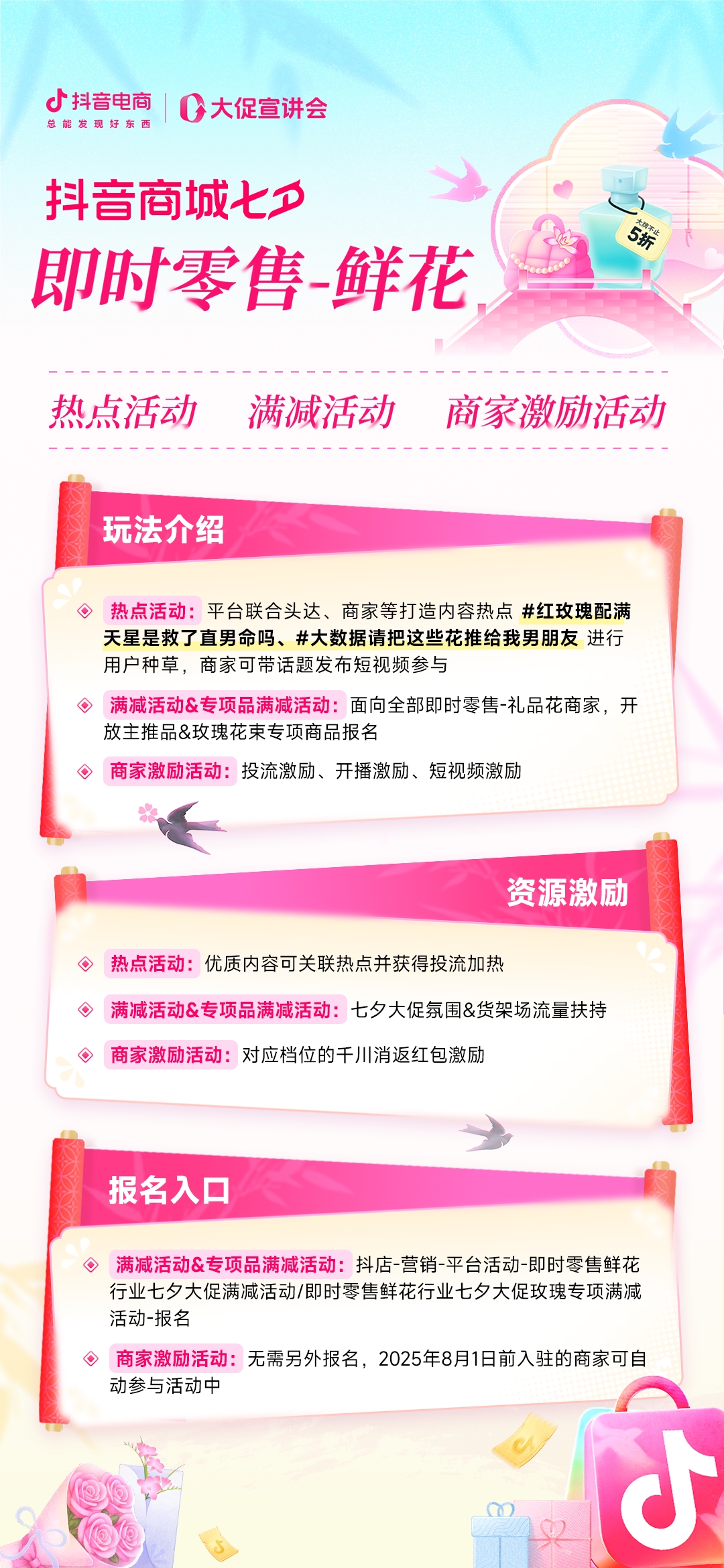 七夕期間,平台聯合打造浪漫熱點話題**#紅玫瑰配滿天星是救了直男命嗎、#大數據請把這些花推給我男朋友** ,商家帶話題發佈種草短視頻,優質內容可獲流量加熱;面向所有即時零售鮮花禮品商家,開放主推品滿減、專項滿減活動報名,並給出參與可享大促氛圍及貨架場流量扶持的福利。