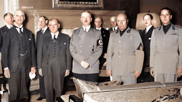 英國首相張伯倫從1938年9月15-22日,一星期內兩次飛往德國與希特勒會談,將捷克斯洛伐克作為禮物送給德國,慫恿希特勒進攻蘇聯。1938年9月20日,英、法、德、意四國首腦——張伯倫、達拉第、希特勒和墨索里尼在慕尼黑的褐色元首宮裏開始會談。