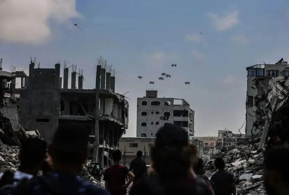 8月8日,飛機在加沙城上空空投物資/新華社發(裏澤克·阿卜杜勒賈瓦德 攝)