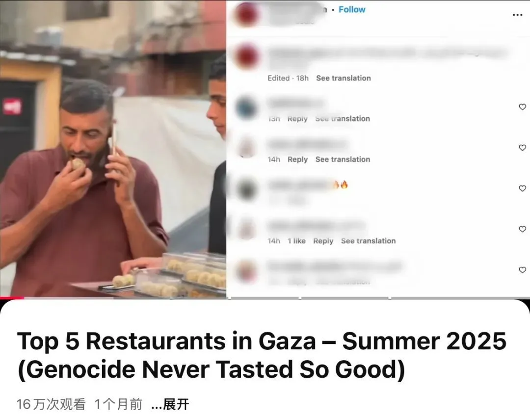與此同時,以色列部分媒體與社交平台也打起了配合戰,刻意突出加沙仍有運作的咖啡館,和零星擺拍的食物照片。一位擁有40多萬訂閲者的以色列YouTube創作者,甚至發佈題為《2025年夏天——種族滅絕從未如此美味》的視頻,以此反諷外界對饑荒的報道。