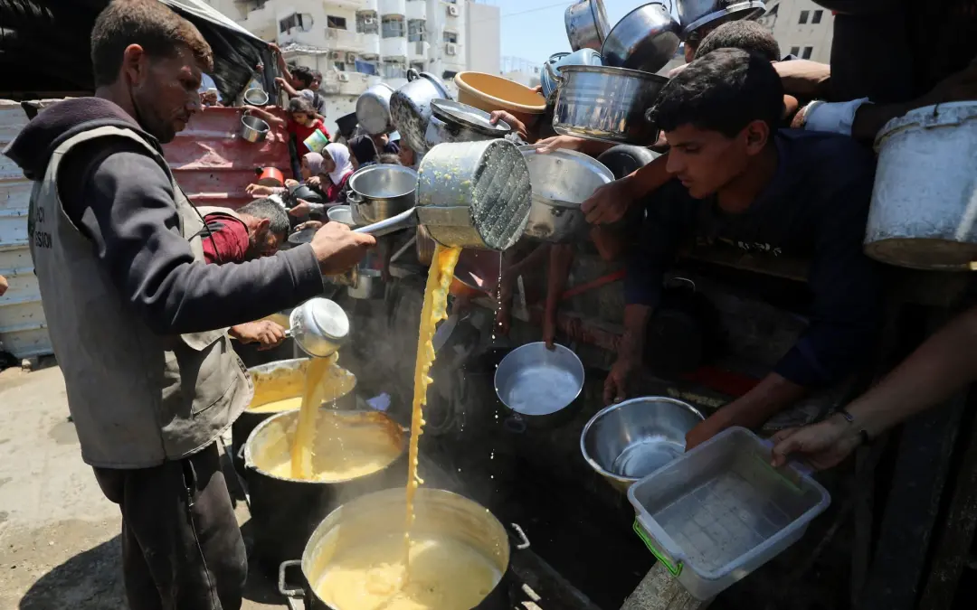 7月14日,人們在加沙城的一處食物分發點領取免費食物/新華社發(裏澤克·阿卜杜勒賈瓦德攝)