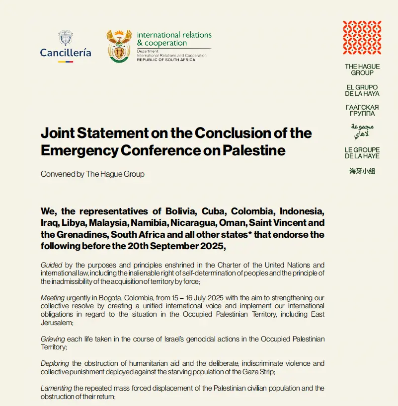 《關於巴勒斯坦緊急會議閉幕的聯合聲明》中提到,於2025年7月15日至16日在哥倫比亞波哥大緊急召開的會議,旨在通過建立統一的國際聲音來加強集體應對能力,並落實在被佔領的巴勒斯坦領土(包括東耶路撒冷)局勢上的國際義務等內容/截圖自:聯合國
