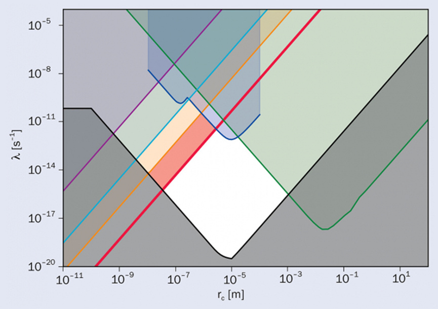 探測物理坍縮 “質量正比”(mass proportional)物理塌縮模型的上限,其中波函數以塌縮率λ被局域在(關聯)長度rc的範圍。圖中陰影區域為各類實驗所排除的參數區間:冷原子干涉儀(cold-atom interferometry)(品紅)、引力波探測器(綠色)、懸臂實驗(藍色)、整體(bulk)加熱限制(青色),以及由桑福德地下研究設施(Sanford Underground Research Facility)馬約拉納驗證裝置(Majorana Demonstrator)合作組[注2]開展的自發 X 射線輻射搜尋(紅色)。先前由自發X射線輻射得到的限制以橙色表示。理論下限用黑色實線標出。圖片來源:Adapted from Majorana Collab. 2022 Phys. Rev. Lett. 129 080401