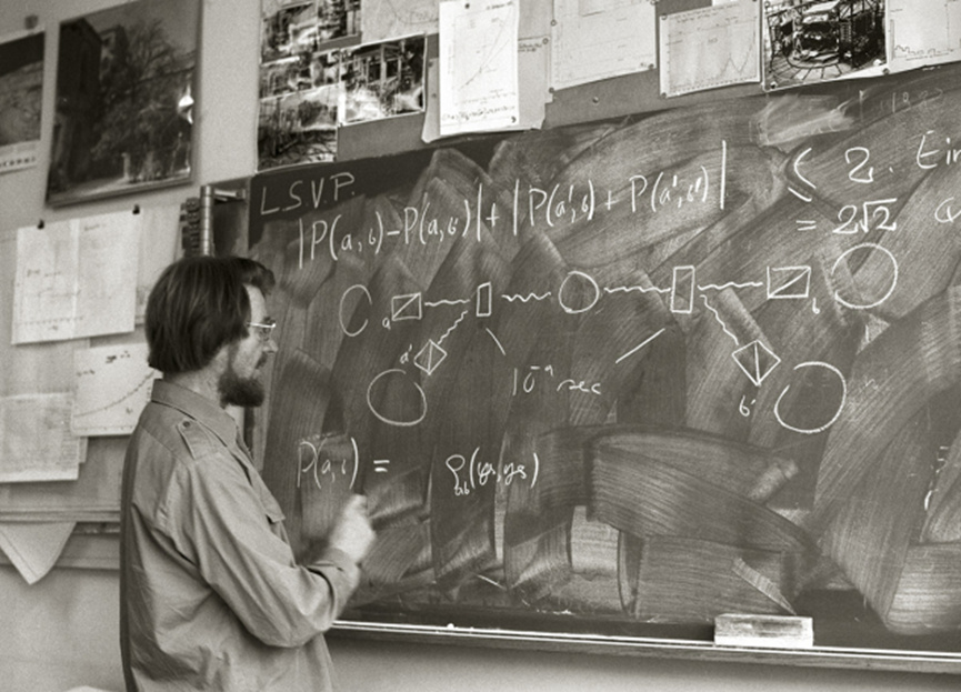非局域性 在1960年代和1970年代,約翰·貝爾重燃人們對量子力學基礎的興趣,為如今充滿活力的量子信息領域奠定了基礎。在圖中的黑板上,糾纏的粒子從中央粒子源出現並傳播到遙遠的探測器。它們的類空分隔(spacelike separation)確保沒有以低於或等於光速傳播的信號在它們之間傳遞。貝爾定理表明,任何僅基於局域隱變量的理論都無法完全解釋量子力學的預言並經實驗證實的相關性。圖片來源:CERN PhotoLabImage 82-6-270