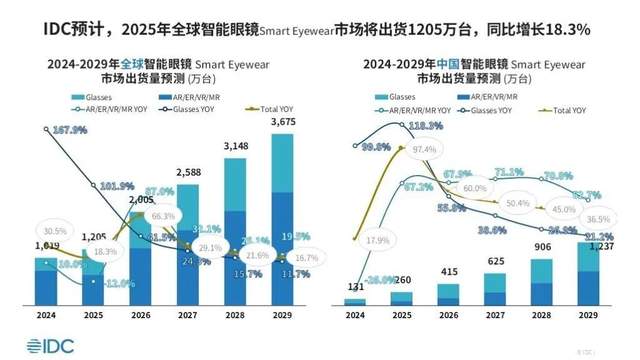 IDC預計,2025年全球智能眼鏡市場出貨1205萬台,同比增長18.3%。其中不具備顯示功能的音頻眼鏡及音頻拍攝眼鏡預計出貨547萬台,同比增長101.9%。