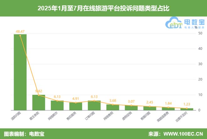 據消費糾紛調解平台“電訴寶”顯示,2025年1月至7月全國在線旅遊涉及投訴的焦點問題依次為:退款問題、霸王條款、網絡欺詐、售後服務、訂單問題、網絡售假、虛假促銷、客服問題、高額退票費、出票不及時等。