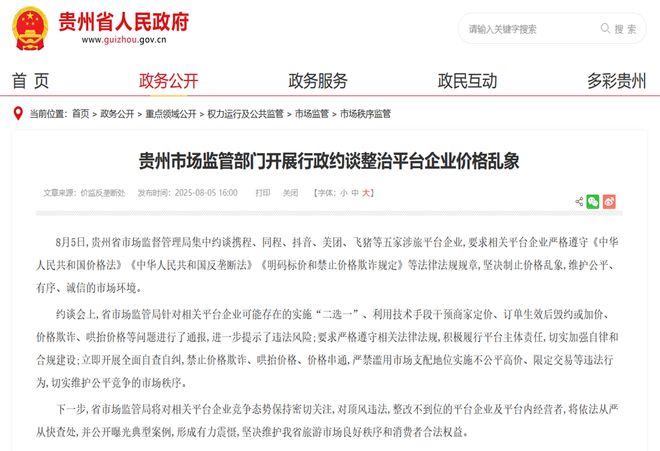 8月5日,貴州省市場監督管理局集中約談了攜程、同程、抖音、美團、飛豬等五家涉旅平台企業。在約談會上,貴州省市場監督管理局通報了平台企業可能存在的違規行為,包括實施“二選一”、利用技術手段干預商家定價、訂單生效後毀約或加價、價格欺詐、哄抬價格等問題,並進一步提示了違法風險。