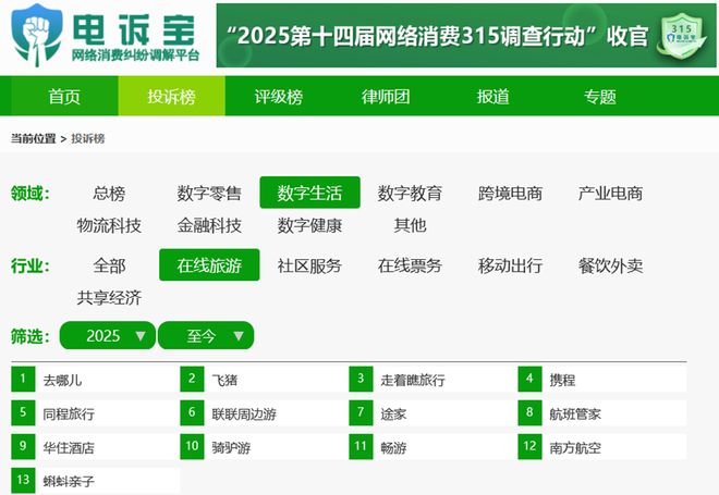2025年1月至7月全國在線旅遊平台按投訴量排名依次為去哪兒、飛豬、走着瞧旅行、攜程、同程旅行、聯聯周邊遊、途家、航班管家、華住酒店、騎驢遊、暢遊、南方航空、蝌蚪親子。