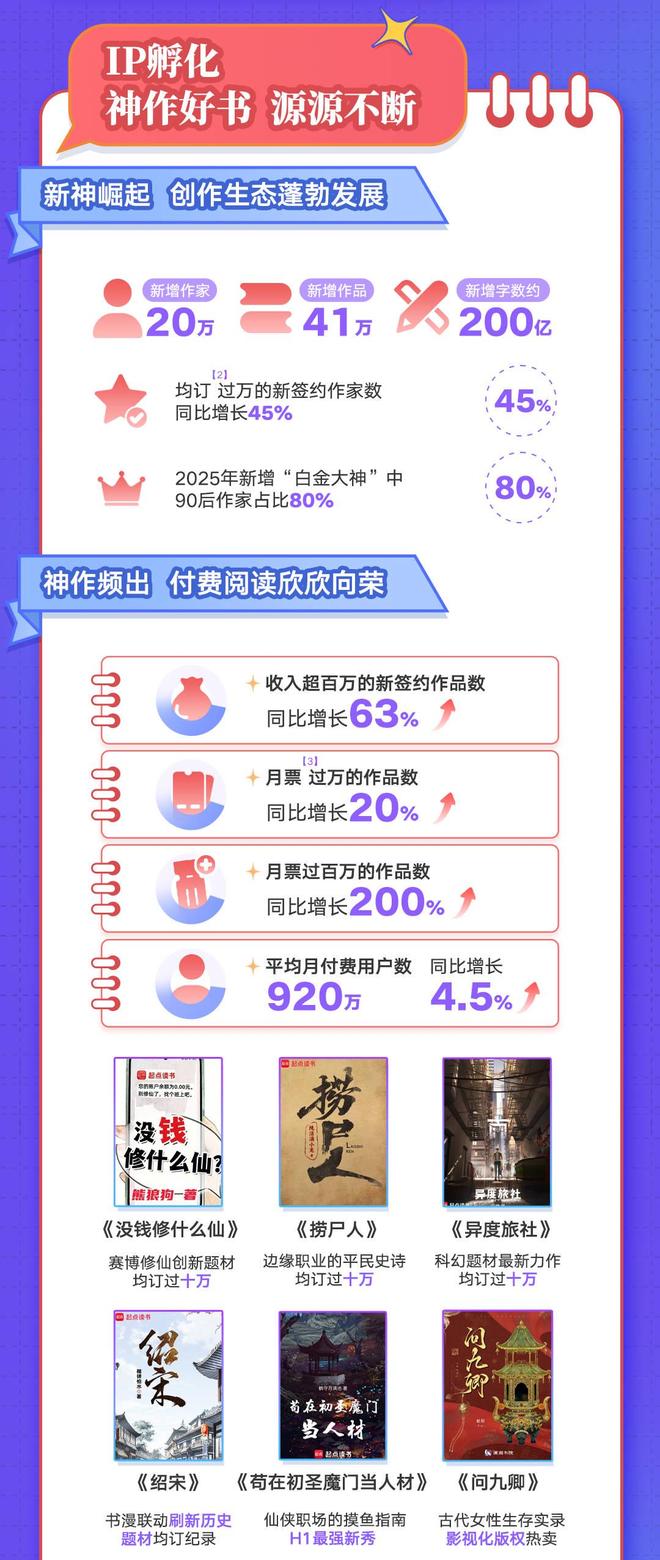 得益於閲文創作生態不斷完善的“造血機制”,優秀的新人作家不斷湧現,新簽約的作家中達成均訂過萬的作家數量同比增長45%。2025年新增白金大神中90後作家佔比近八成,並出現多位95後新鋭作家。新生代創作力量帶動在線閲讀神作頻出,閲文新簽約的作品中收入超過100萬元的數量同比增長63%,《沒錢修什麼仙》《撈屍人》《異度旅社》均訂更是突破十萬大關。